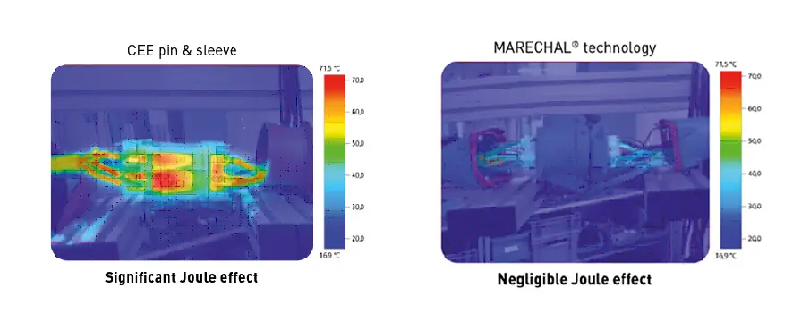 Para além de aumentar o tempo de vida da conexão, o número de ciclos (on/off) e de também permitir com que aguente picos de corrente até 8x a corrente nominal, a tecnologia Marechal reduz a resistência dos contactos e as perdas por efeito de Joule significativamente, ao fim de 10 anos os conectores da Marechal são 30x mais eficientes que uma conexão “CEE“.